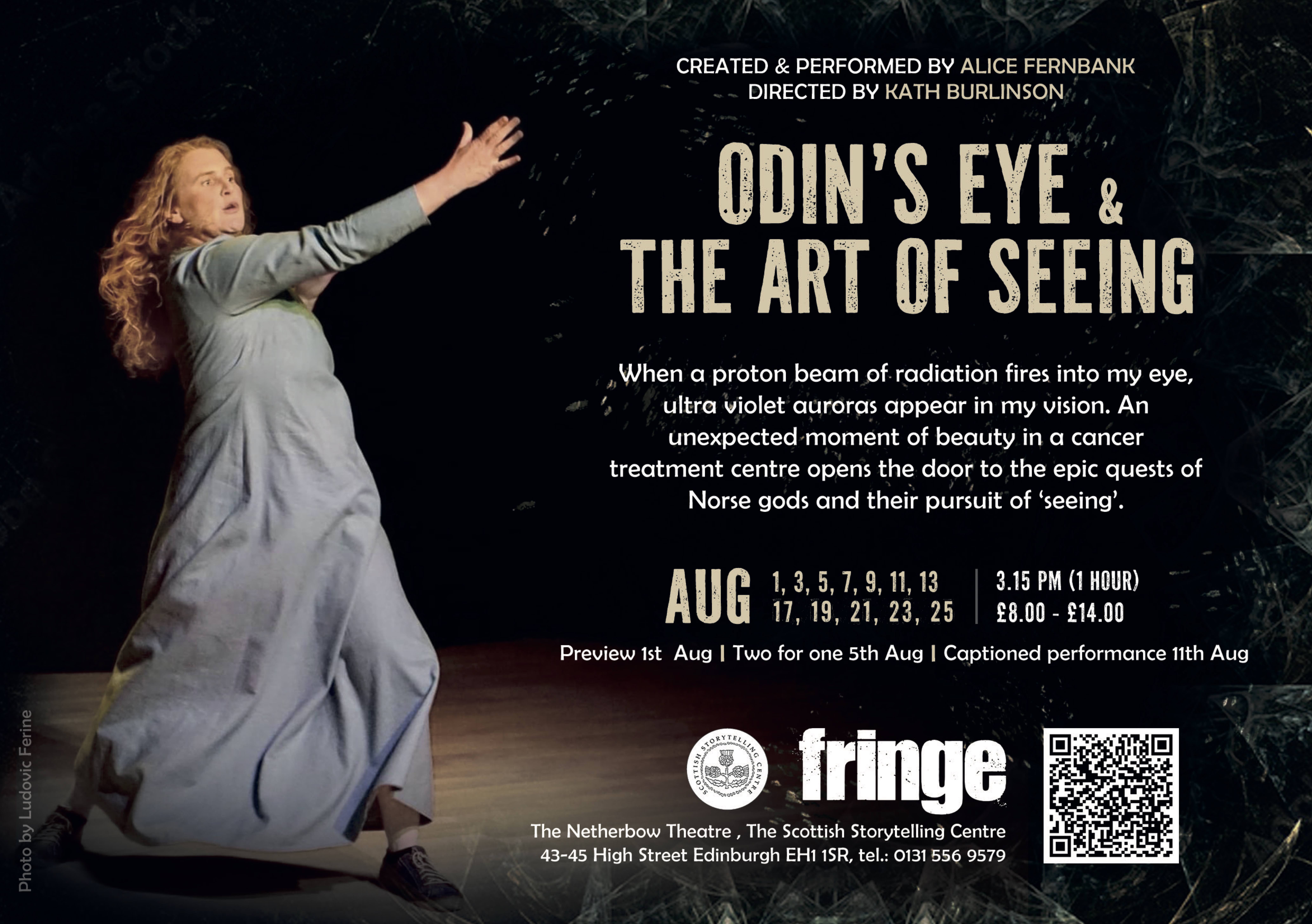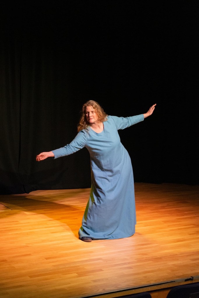 The idea for this show emerged from the refuge I sought in myth during the diagnosis and treatment of a melanoma in my eye. Throughout this entire period I was co-facilitating weekly myth sessions online with my partner Svend-Erik Engh and an intimate group of like minded myth divers from around the world. Every week someone would tell a myth and together the group would use that story to expand into their own creativity. There were certain stories which spoke to me about my experience and seemed to mirror the gravity of my personal tale. When an opportunity arose for me to share some new work in progress at Scottish International Storytelling Festival in 2021 the piece came together effortlessly within a matter of days. It was as though it had been forming in my subconscious mind for months. I performed a 40 minute version of the piece at the 2021 storytelling festival in its first draft followed by a discussion led by Donald Smith, Director of TRACS and the SSC at the time. I was greatly encouraged to develop the piece further and in 2023 I was commissioned by the SISF once more to stage a full performance. At this point I needed a strong outside eye to help make the piece stage worthy. Director Kath Burlinson came onboard and she worked wonders fine tuning and refining the piece for the stage.